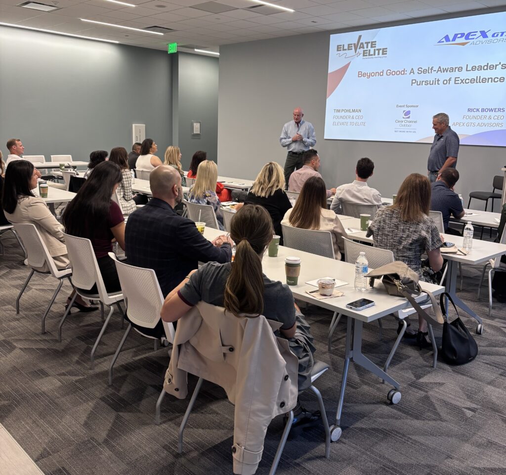 A joint project by Elevate to Elite Founder/CEO Tim Pohlman and ApexGTX Advisors Founder/CEO Rick Bowers brought 40 people together in Phoenix on October 8, 2025 for a workshop titled “Beyond Good: A Self-Aware Leader’s Pursuit of Excellence.” The breakfast session focused on what separates average leaders from excellent and elite leaders. These experts provided practical tools to sharpen one’s focus, elevate your impact, and lead with greater clarity and accountability. Everyone who attended came prepared to roll up their sleeves and engage in strategies for growth and development.